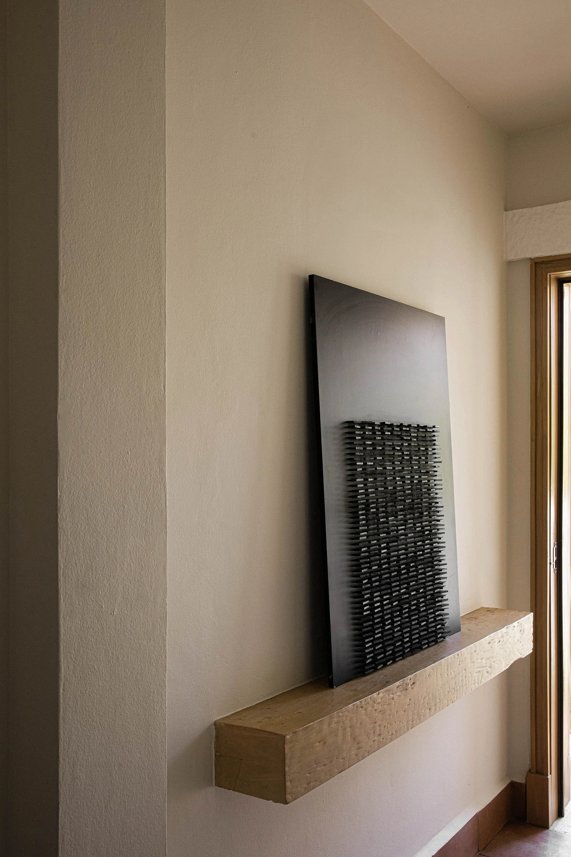 La instalación logra crear un diálogo entre arte y arquitectura, integrando materiales naturales, texturas orgánicas y acabados contrastantes que aportan sofisticación, calidez y carácter contemporáneo al espacio.
